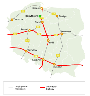 - w bezpośrednim sąsiedztwie węzła autostradowego Kopytkowo.